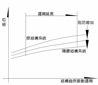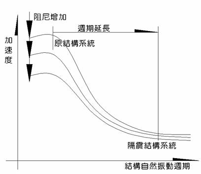 下圖為一般地震的加速度反應譜,參考圖(1.1)中的反應譜可知,藉由周期的偏移(Period Shift),可降低加速度的反應值。但參考圖(1.2)中之位移反應譜,隨著結構周期的延長,位移反應將會相對的增大。早期隔震技術的應用,即因為無法處理大位移問題而中止一段時間。圖(1.1)及圖(1.2)中亦含有位移及加速度與阻尼間之關係,隨著阻尼的增加,加速度反應值及位移反應值均相對的減少。隔震消能裝置的原理,即利用延長結構基本振動周期及阻尼比增加之合成效應,以達到輸入地震力的折減,並控制產生之相對位移。
