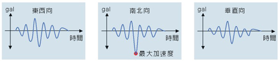 地震時,地震儀分別記錄三個方向的地表加速度,地震震度即是依據最大加速度劃分 |