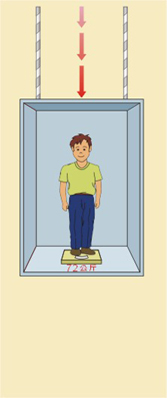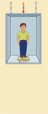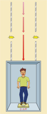 上圖中,「gal」是加速度的單位,1 gal = 1 cm / sec²。980 gal大約等於一個重力加速度 (1g),也就是 物體從天空中落下,掉落速度加快的程度。以生活經驗來說,就像走路時不小心腳底踩空墜落,搭電電梯時不幸遇 上纜索斷裂電梯墜落的感覺。 當所站立的地面,向下運動的加速度接近一個重力加速度(980 gal),會使地面與物體出現「騰空分離」現象。 這個現象可用電梯例子來解釋: |