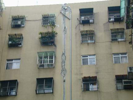 該建物屋齡約19年,為數棟12層大樓緊鄰之國宅,大樓間之伸縮縫嚴重分離碰撞,12樓頂部有碎裂現象,建築內部無裂紋。