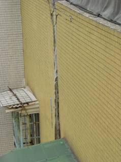 大樓間伸縮縫嚴重分離碰撞,造成外牆磁磚剝落