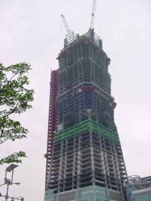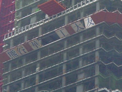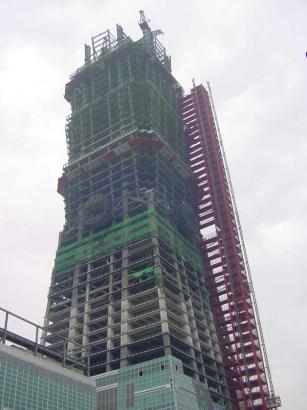 圖4 興建中之台北國際金融中心大樓,由圖中可看出部份看版已經掉落。 |