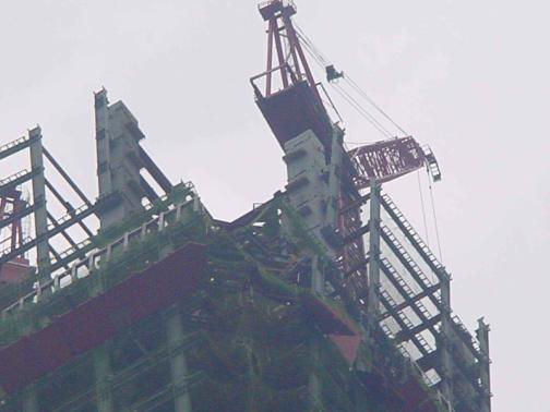 圖2 興建中之台北國際金融中心大樓。由圖中可看出部份看版可能因人字臂掉落撞擊而產生掉落。 |
