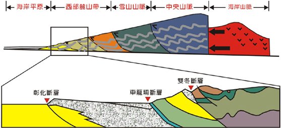 「推土機模型」示意圖參考美國構造地質學者John Suppe的「薄皮構造理論」 |