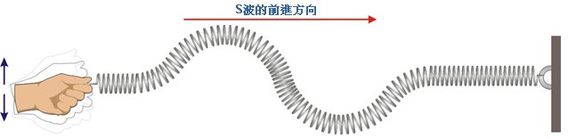 波的行進就像將彈簧的一端固定在牆上,另一端用手抓住上下甩動一樣,波的行進方向與介質的振動方向是垂直的,藉由介質的變形,能量向外傳遞。