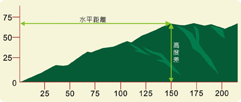 坡度的計算方式為:高度差÷水平距離 以下圖為例,從水平距離0公尺至150公尺處的坡度為 70÷150=46.7% |