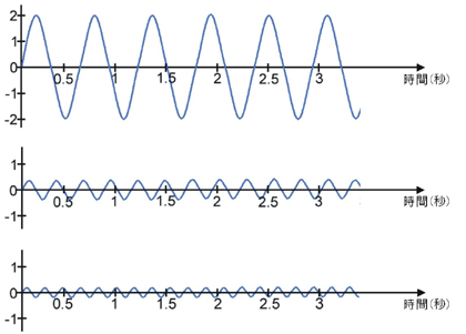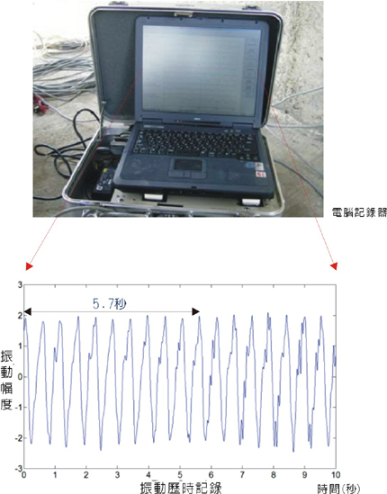 從電腦記錄器輸出的振動歷時記錄,工程師能判斷該樓房的振動週期。以上圖為例,樓房振動10次約歷時 5.7秒,所以此建物自然振動週期約是0.57秒。 細看上頁的振動歷時記錄,可發現樓房的振動行為並不像單擺的單純,振動過程包含了好幾個不同的振動 週期。利用數學運算可將振動歷時記錄,大致分解成三個振動週期的波形: |