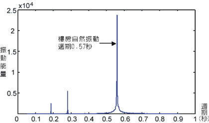 不同振動週期的波形,各有不同的振動能量,以上三個振動週期的波形,如果以「能量對應週期分佈」來表 示,就會形成下圖,其中秒數最長的週期,能量通常也最大,這個週期就是樓房的自然振動週期。 |