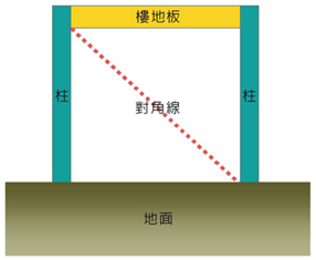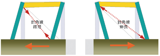 地震時建築擺動,原本的方形空間變成菱形,對角線的長度因而縮短或伸長。 |