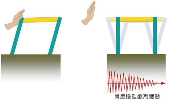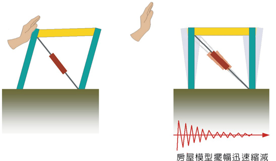 在模型的對角線上裝上一根斜撐,斜撐上有一個可以吸收振動能量的「減震器」,相同側推之後迅速釋放, 模型仍會晃動,但是晃動的時間縮短、幅度縮小,這就是減震器的功用。 |