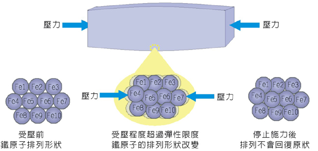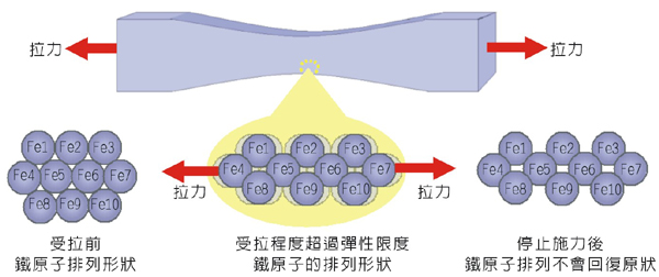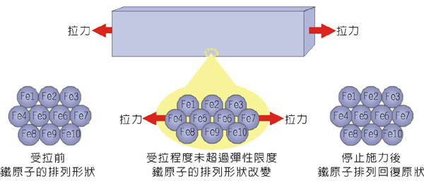 長條形鋼材承受拉力而伸長變形時,如果「變形程度」沒有超過材料的「彈性限度」,當停止施力後,鋼材 會回復成原來的長度,鐵原子回復成原本的排列形狀。 |