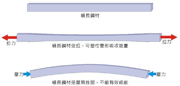 受到束制的細長鋼材,回復塑性變形能力,可發揮吸能減震的效果 |