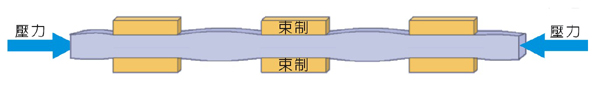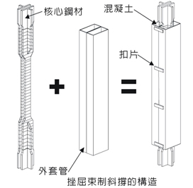 為避免細長鋼材過早挫屈,可外加「束制」固定,束制的範圍越大,細長鋼材越不容易挫屈。鋼材承受壓力 時,能塑性變形吸能減震。 |