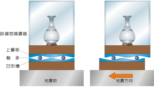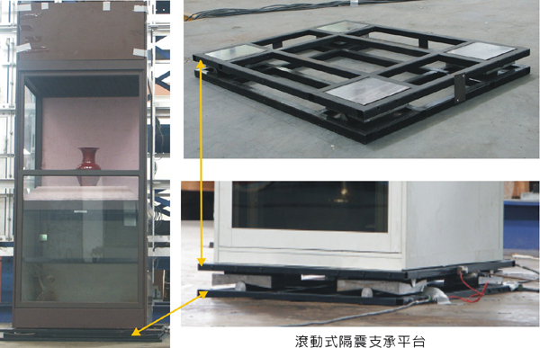 工程師應用和滑板相同的隔震原理,發明「滾動式隔震支承平台」,安裝於樓地板與櫥櫃之間,以隔離樓地 板的水平振動,減輕櫥櫃裡的藝術品或精密儀器設備所承受的地震擾動。 |