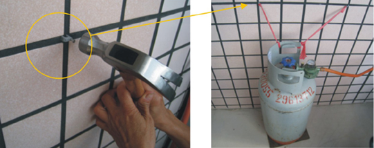 預防地震引起火災,瓦斯用畢應隨手關閉。家用桶裝瓦斯平時應固定好,以免瓦斯桶傾倒,扯斷瓦斯管線, 造成瓦斯外洩。固定桶瓦斯,可用堅固的繩索或鐵鍊束制瓦斯桶的活動。地震後應確認家中沒有瓦斯外洩的情形 ,才能用火或開啟電源。 |